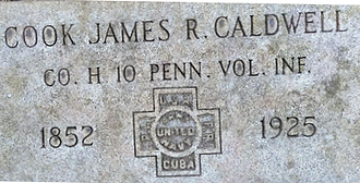 In 1898, Pvt. James R Caldwell served in the U.S. Army with Company H, “Fighting Tenth” Regiment of the PA Volunteer Infantry for 11 months in the Philippine Campaign of the Spanish-American War. He first served as a cook, but later was sworn in for enlistment under a special order of the government.